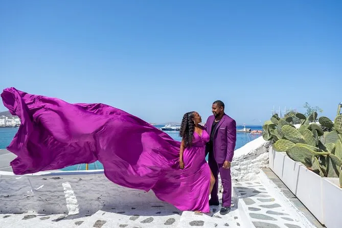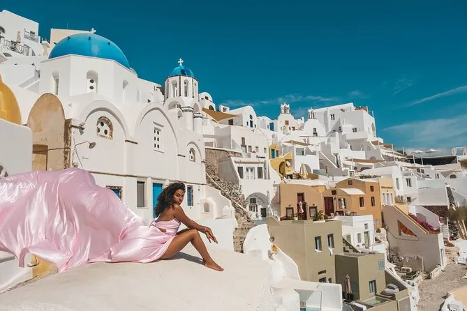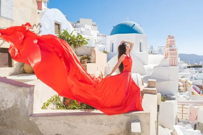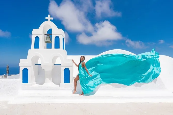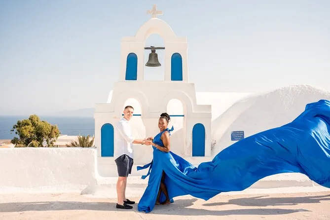Votre journée comprend le transfert depuis Oia ou Imerovigli (autres lieux possibles avec supplément), une séance privée dans des lieux emblématiques comme les dômes bleus et les points de vue sur la caldeira, l’aide pour choisir parmi 16 couleurs de robes volantes faites main, une assistante qui fait voler votre robe à chaque prise, et 50 photos retouchées livrées dans la semaine suivant la séance.