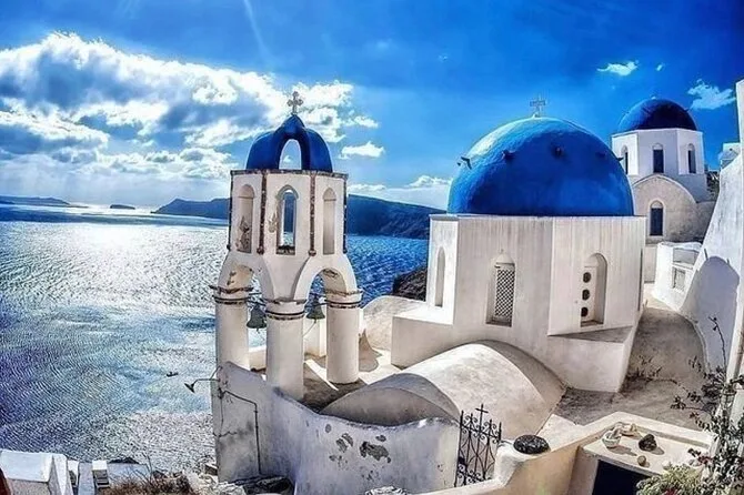 Le tour inclut le phare d’Akrotiri, la plage Rouge, la plage de Perissa, le village de Pyrgos avec le monastère Profitis Ilias, les dômes bleus et le village d’Oia.