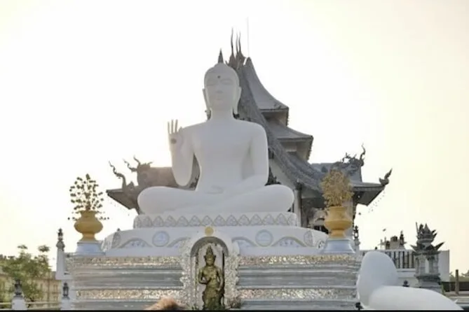 Ensuite, nous sommes entrés dans le monastère royal thaïlandais — tout blanc et or à l’extérieur, mais à l’intérieur trône un immense Bouddha en bronze qui semble presque briller dans la pénombre. J’ai essayé de prononcer quelques mots en thaï (Li a ri, j’ai sûrement massacré la langue), puis nous avons croisé des moines en robes safran qui nous ont salués sans ralentir. L’air était lourd d’humidité et d’une odeur douce — peut-être des fleurs ? Ou juste la chaleur pesante. On s’est arrêtés pour un chai dans une petite échoppe avant de rejoindre la statue du Grand Bouddha. Elle est énorme de près — 25 mètres de haut — mais ce qui m’a marqué, c’est le silence respectueux qui s’est installé autour de sa base.