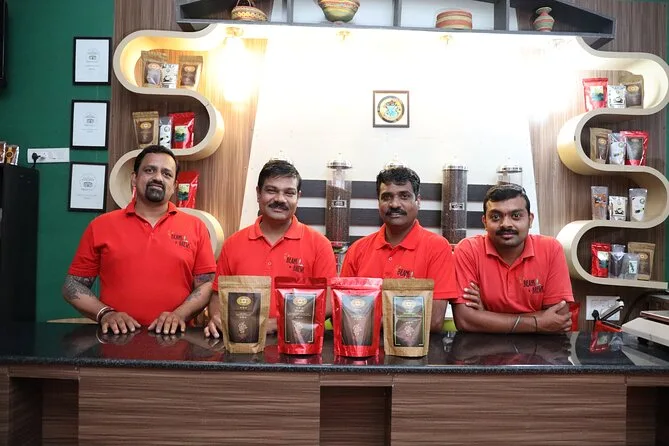 Votre journée comprend une visite guidée à pied du domaine Mercara Gold, plantation de café et d’épices près de Madikeri, avec plein d’histoires en chemin, l’entrée au tout nouveau Musée mondial du café et une tasse de café filtre fraîchement préparée au café du domaine. Des parapluies sont fournis en cas de pluie pour que vous puissiez continuer à explorer sans souci.