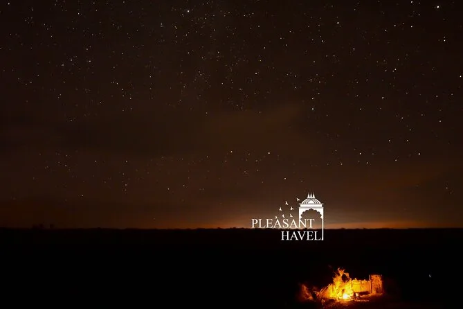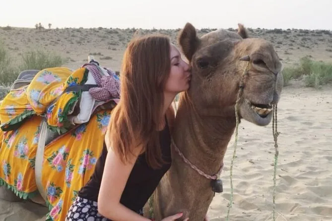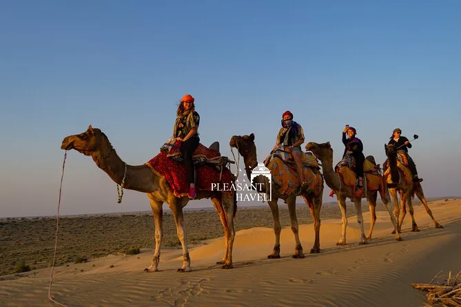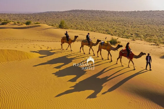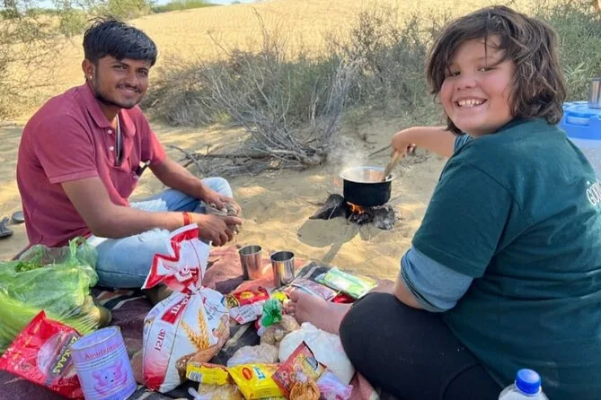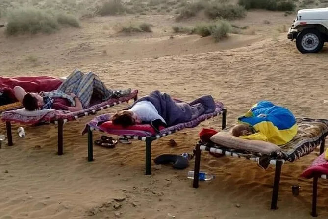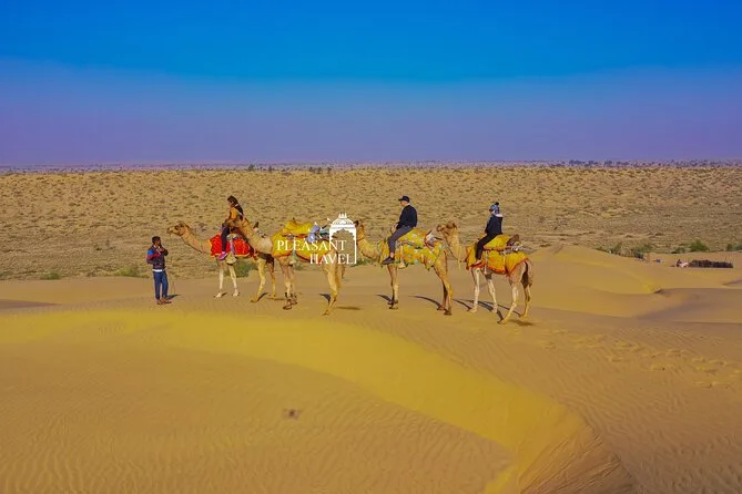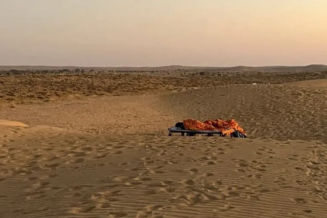 Votre voyage comprend un dîner sous les étoiles du désert et un petit-déjeuner le matin, ainsi que du temps avec les chameliers locaux qui vous guideront à travers villages et dunes près de Jaisalmer. Vous aurez accès à la consigne bagages, aux toilettes et au Wi-Fi en ville avant le départ — puis, il n’y aura plus que vous, votre guide et le ciel immense du Rajasthan jusqu’au retour à Jaisalmer le lendemain.