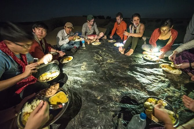 À l’arrivée à l’oasis, vous aurez du chai ou du café à volonté, des snacks comme des pakoras et des chips pendant les pauses, ainsi qu’un dîner végétarien complet cuisiné sur place. L’eau est toujours disponible. Pour la viande ou l’alcool, prévenez-nous à l’avance, un supplément sera appliqué.
