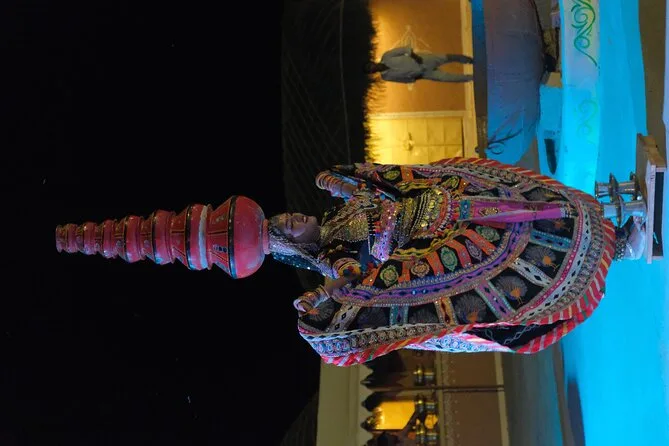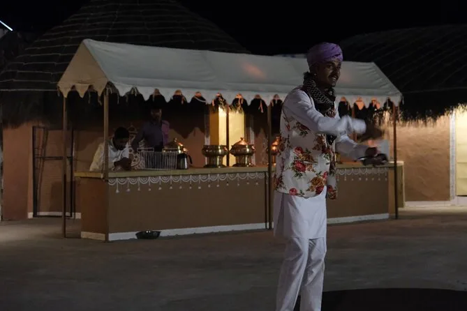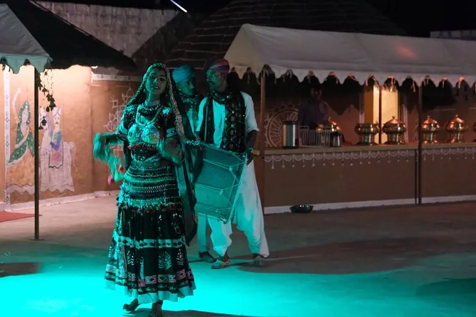 De retour au camp une fois la nuit tombée, on nous a offert un chai chaud et des pakoras croustillants autour d’un feu de camp. Les musiciens folkloriques se sont installés juste à côté de nous — des rythmes de tabla mêlés à des chants qui résonnaient dans la nuit. Les danseuses en saris colorés tournaient si près qu’on voyait chaque paillette scintiller sous la lumière du feu. Elles nous ont même invités à participer (j’ai fait de mon mieux). Le dîner était un buffet de spécialités locales — le dal baati churma m’a particulièrement marqué — tout avait ce goût frais et fait maison. À 22h, nous étions de retour en ville, fatigués mais vraiment ravis de ne pas avoir manqué cette expérience.