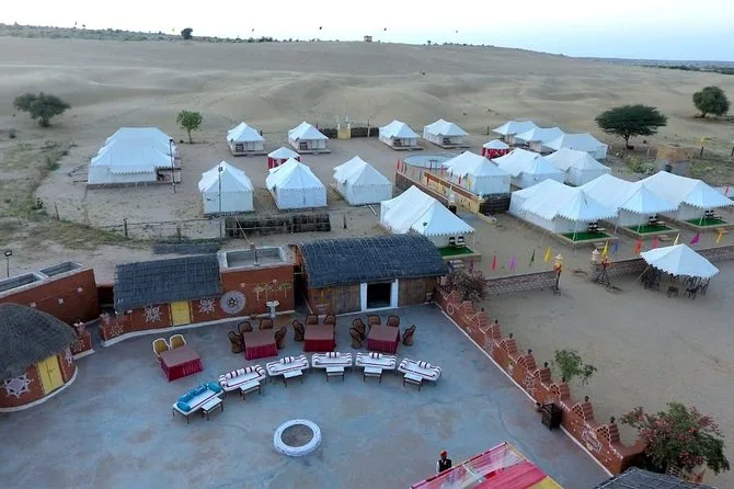 La journée inclut de l’eau en bouteille à volonté ; visites guidées du village de Kuldhara et du fort Khaba ; thé d’accueil et encas au camp ; safari à dos de chameau de deux heures au coucher du soleil (un chameau par personne) ; dîner buffet avec produits locaux ; transport en jeep entre les sites ; et un spectacle vivant de musique et danse folklorique sous les étoiles du désert.