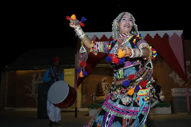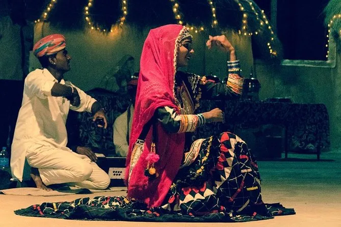 Une immersion complète en une journée : villages abandonnés, balades à dos de chameau au coucher du soleil, musique live sous les étoiles et cuisine rajasthanie authentique — sans avoir à passer la nuit.