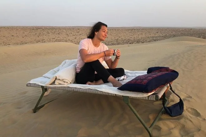 Le dîner était simple mais meilleur que n’importe quel repas en ville. Des chapatis cuits au feu de bois, des lentilles fumées, et un thé sucré qui coupait la sécheresse de l’air. Après le repas, tout le monde s’est assis tranquillement — peu de paroles, juste le crépitement du feu et les ombres dansant sur les tentes. Dormir là-bas était étrangement apaisant ; je me suis réveillé une fois dans un silence total, à part quelques clochettes de chameaux au loin. C’est sûrement ça, la « magie du désert », même si ça paraît un peu cliché écrit comme ça.