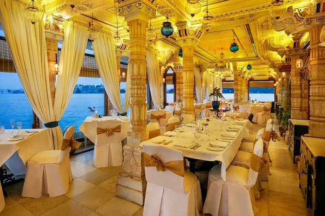 Votre expérience comprend les transferts privés en voiture depuis n’importe où à Udaipur jusqu’au lac Pichola, une balade en bateau partagée jusqu’à l’île Jag Mandir, et un dîner 3 plats (végétarien ou non) au restaurant du palais. Vous n’avez qu’à vous présenter, tout est pris en charge.