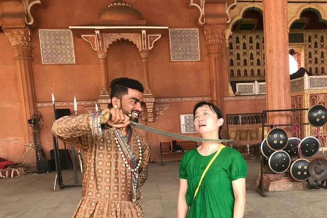 On a déambulé dans le décor du Baroda Palace — oui, celui de “Prem Ratan Dhan Payo” — et j’arrivais encore à voir des paillettes accrochées aux marches. Ensuite, le Sheesh Mahal, couvert de milliers de petits miroirs où votre reflet se multiplie à l’infini en avançant. L’intérieur est plus frais que dehors (heureusement), et la lumière y danse partout. On s’est glissés dans le décor du Fort d’Agra (tiré de “Jodha Akbar”), puis on a traversé une rue de marché animée où les vendeurs locaux viennent parfois boire un chai entre deux prises. Avec un peu de chance, vous entendrez des cris ou des bruits de tournage au loin.