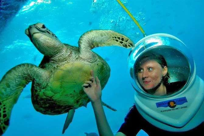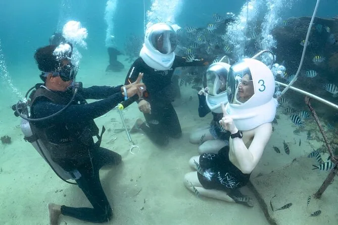 Un casque spécial relié à une bouteille d’air est fourni pour respirer en toute sécurité sous l’eau.