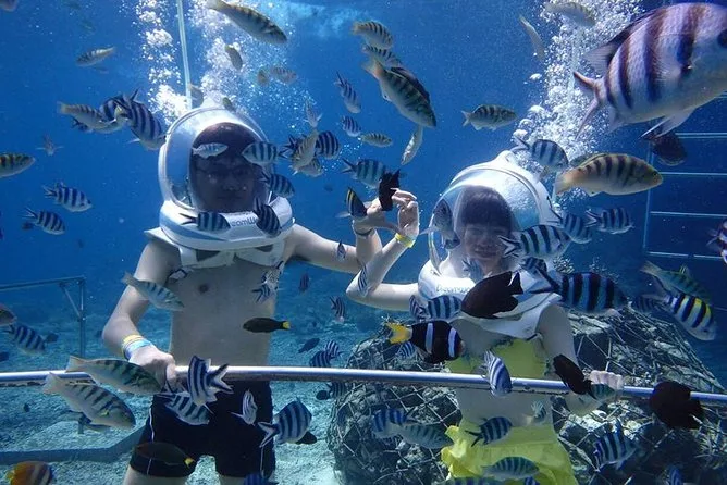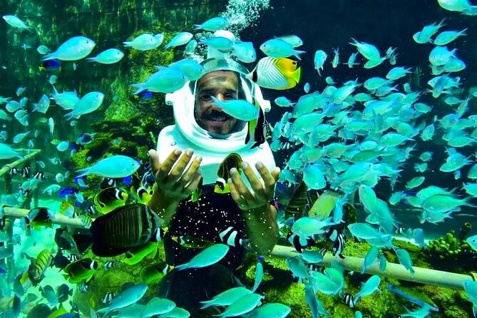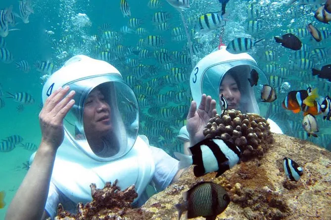 Plongez dans l’océan de Bali à Tanjung Benoa et marchez sur le fond marin accompagné d’un guide local. Vous porterez un casque spécial pour respirer facilement, entouré de poissons tandis que la lumière filtre à travers l’eau verte. Tout le matériel est fourni, avec option transfert hôtel, pour un moment sous-marin inoubliable bien après le séchage.