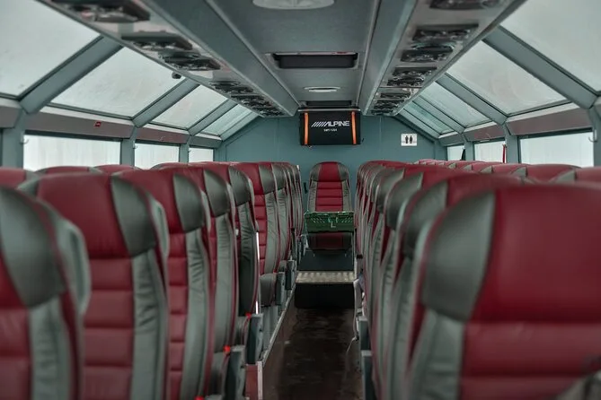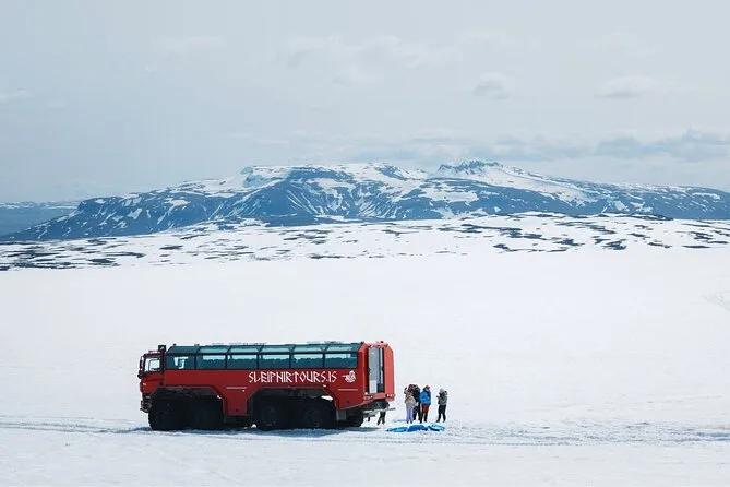 Votre journée comprend le transfert en bus des Hautes Terres de Gullfoss jusqu’à la base du monster truck Sleipnir, une visite guidée de 3 à 4 heures au glacier Langjökull à bord de l’un des plus grands trucks d’Islande avec fenêtres panoramiques, l’accès à une vraie grotte de glace (crampons fournis), le WiFi à bord, ainsi que des toilettes pendant le trajet, avant de revenir à la cascade Gullfoss.