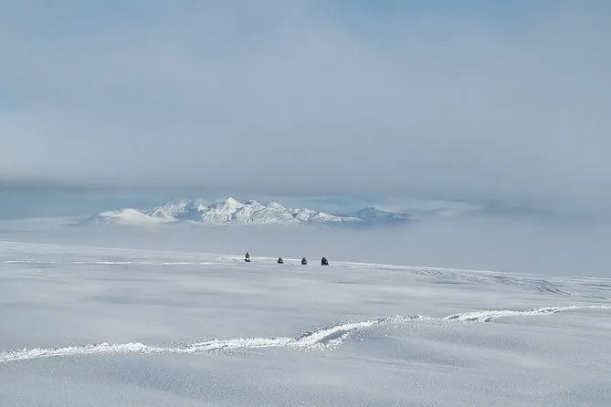 La balade en motoneige sur le glacier Langjökull dure environ une heure, avec une pause pour photos ou changement de pilote.