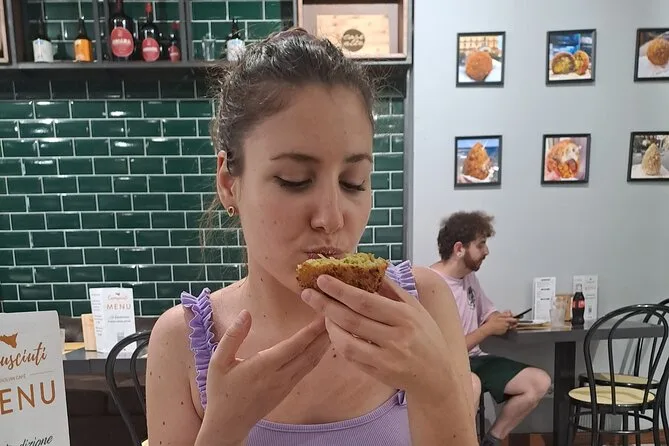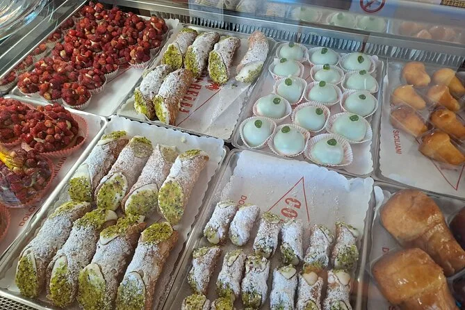 Vous dégusterez la caponata sicilienne, des cônes de poisson frit du marché, la cipollina (pâtisserie aux oignons et fromage), la cartocciata (pâtisserie rustique farcie), ainsi que des cannoli ou une granita sicilienne en fin de parcours.
