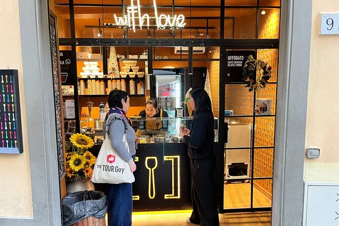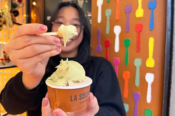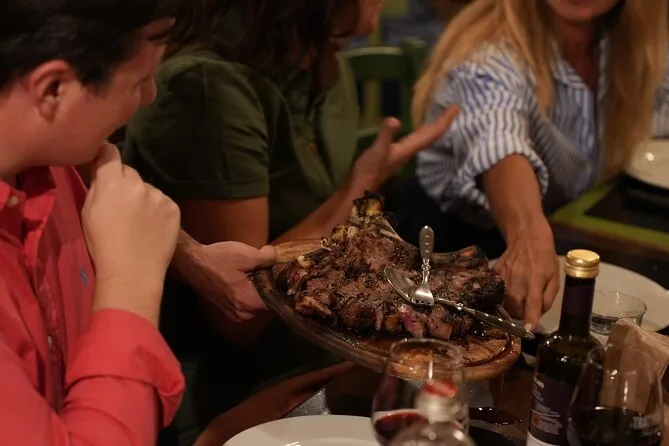 Votre soirée comprend 14 dégustations réparties sur cinq étapes savoureuses : snacks à la buvette historique de vin, apéritif avec charcuteries et fromages locaux sur la Via dei Neri, raviolo maison accompagné de vin toscan, dîner assis avec steak florentin saignant et pommes de terre rôties dans l’Oltrarno, puis gelato artisanal pour finir — le tout guidé par un passionné anglophone en petit groupe.