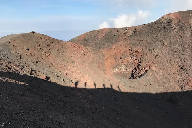 On a atteint le bord du cratère après environ une heure, je crois ? Difficile à dire, j’étais souvent arrêté à regarder ces couleurs étranges dans la cendre — des stries rouges sur fond noir et gris, comme des bleus à l’âme. La vue est immense là-haut ; on aperçoit même les anciens téléskis qui ont fondu. Les enfants du groupe ramassaient des petites bombes volcaniques (Salvo leur a rappelé de ne rien garder). Sur le chemin du retour, mes chaussures se sont remplies de cendres, mais ça m’était égal — j’étais trop absorbé par ce calme incroyable dans un endroit si sauvage.