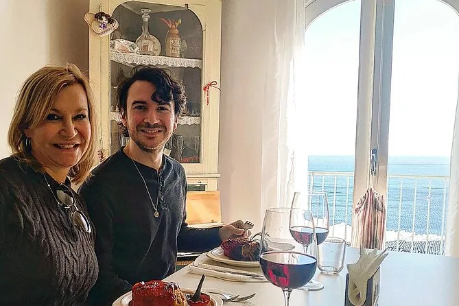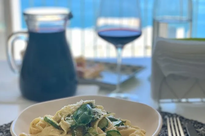 Votre journée comprend tous les ingrédients pour cuisiner chez une famille de Praiano, un verre de bienvenue avec vin maison et apéritif, un repas complet avec entrée traditionnelle, deux types de pâtes fraîches à base de produits de saison ou de la pêche du jour, un dessert préparé par Mamma Annamaria, de l’eau pendant le repas, et leur digestif maison spécial pour finir — sans oublier les échanges chaleureux tout au long.