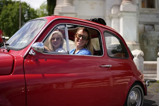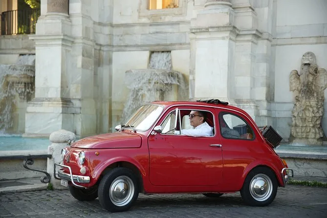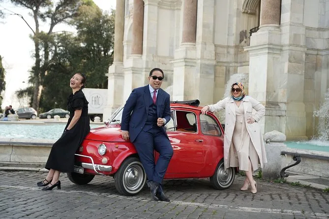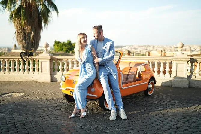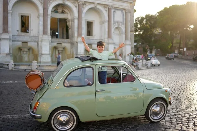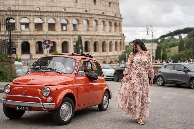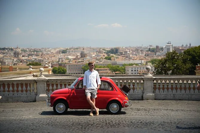 Votre journée comprend un transport privé en Fiat 500 vintage avec un chauffeur local qui est aussi votre photographe professionnel — plus cinquante photos JPEG de haute qualité prises lors de votre aventure autour des monuments et points de vue de Rome.