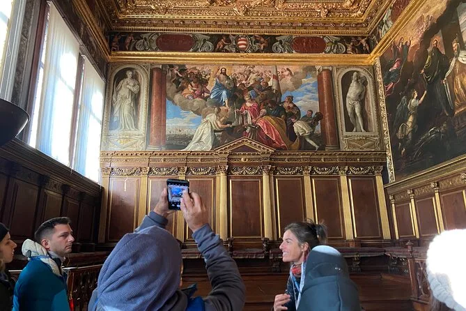 Ensuite, direction le Palais des Doges ; on est entrés directement (encore une fois, les billets réservés à l’avance, c’est un vrai plus). Les murs étaient recouverts de peintures impressionnantes — scènes de batailles et de saints — et Giulia expliquait que chaque pièce avait été conçue pour impressionner ou intimider. Elle a parlé de quelques sculpteurs du XIVe siècle dont j’ai déjà oublié les noms (désolé Giulia), mais ce qui m’a marqué, c’est son histoire sur Casanova qui s’est échappé de la prison du palais. Il y avait un couloir un peu froid où les voix résonnaient — presque comme dans un théâtre.