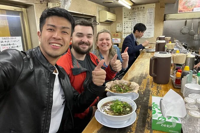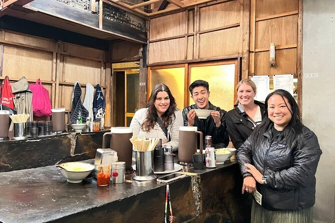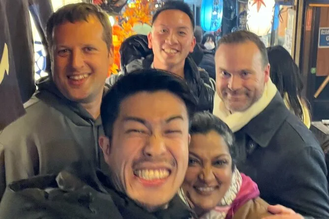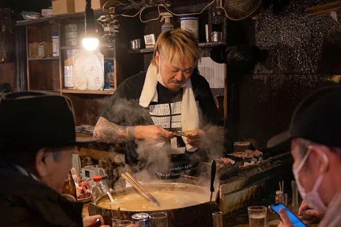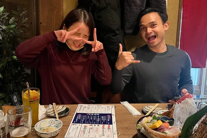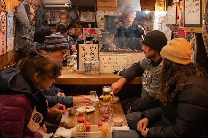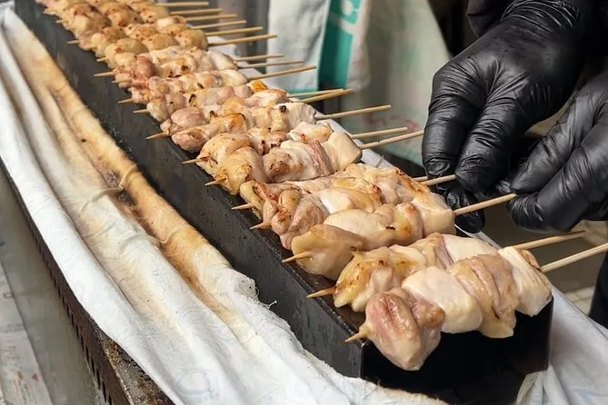Vous dégusterez des classiques locaux comme yakitori, karaage (poulet frit), gyoza, sashimi, et d’autres selon les arrêts.