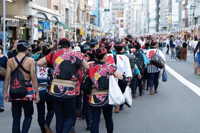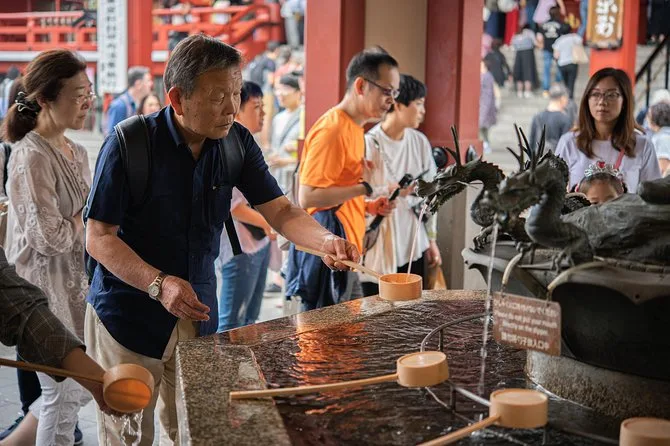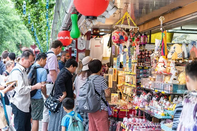 Votre journée comprend des dégustations complètes chez cinq vendeurs historiques d’Asakusa, des balades guidées dans les rues de marché jusqu’au temple Senso-ji et la Porte du Tonnerre, des arrêts dans des boutiques spécialisées et restaurants familiaux (comme un bar à sushi debout et une adresse de soba), ainsi que plein d’anecdotes racontées par votre guide local.