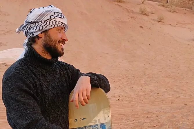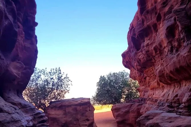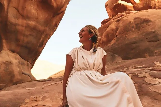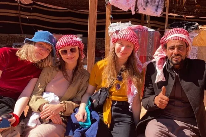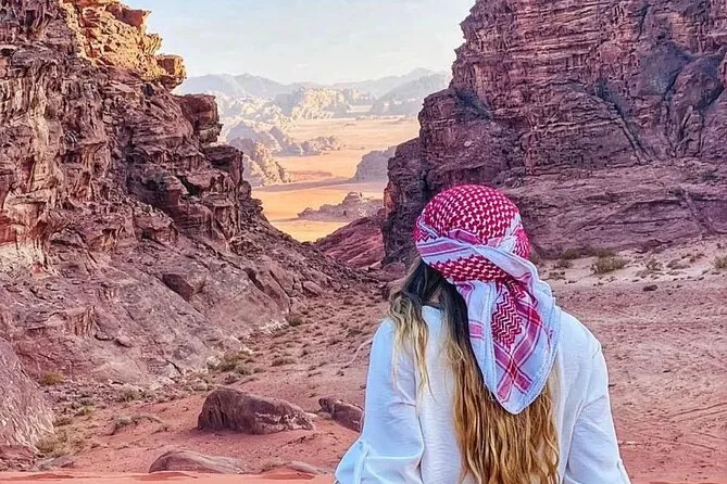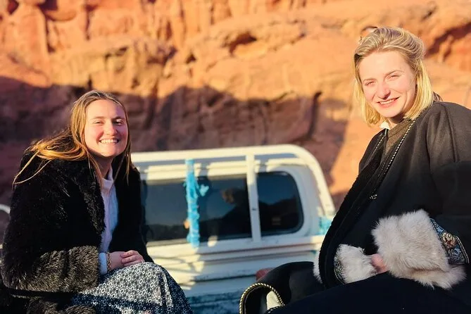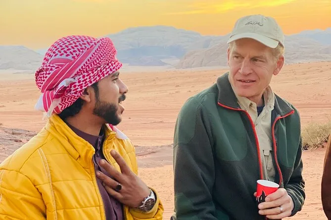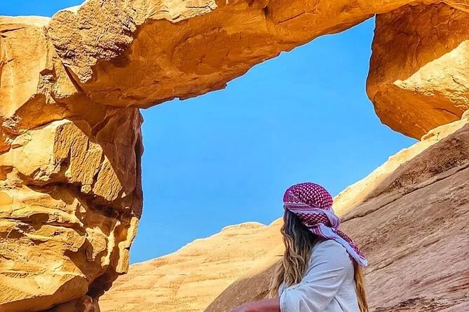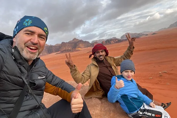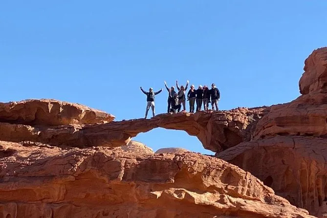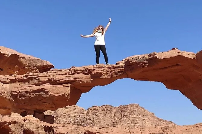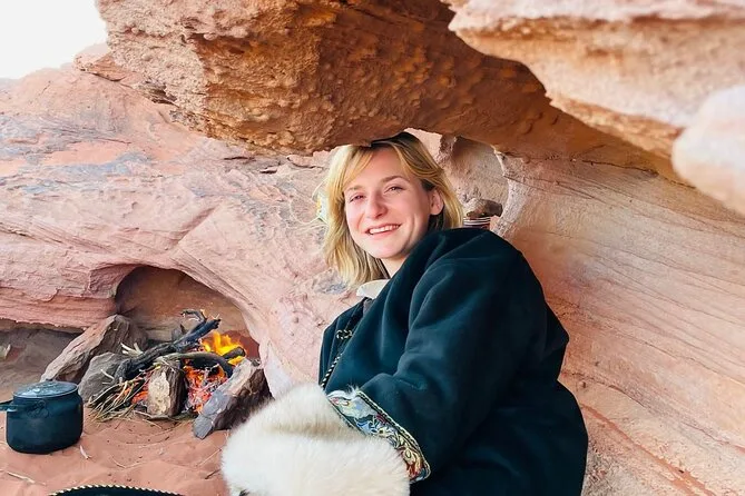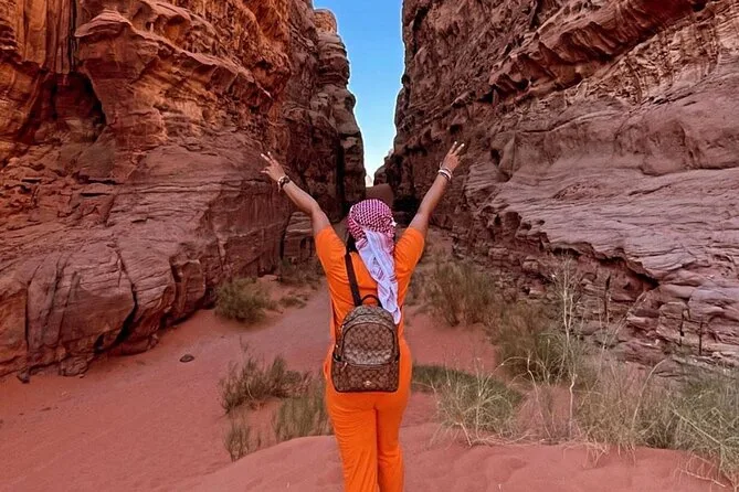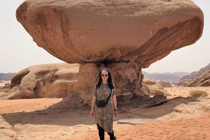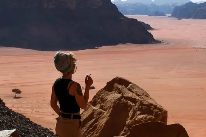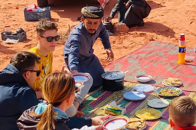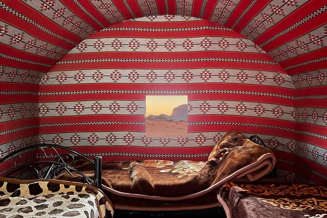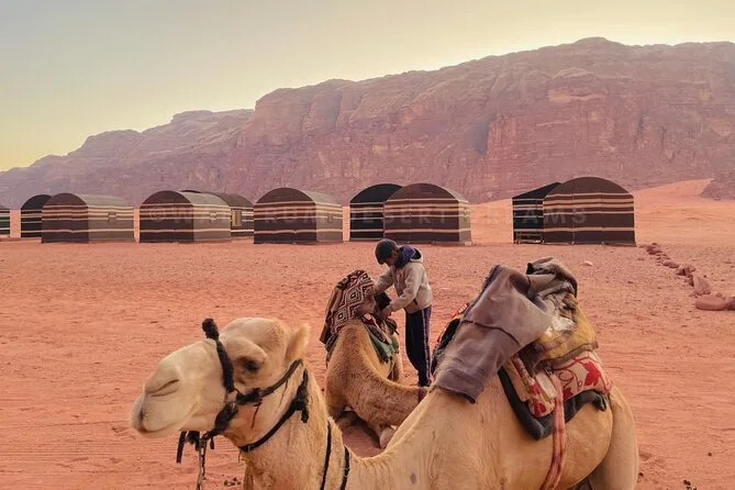 Votre journée comprend le transfert en jeep depuis le Wadi Rum Village Rest House vers tous les sites avec un guide local ; eau en bouteille et thé bédouin sucré à disposition ; déjeuner traditionnel cuit au feu de bois ; dîner et petit-déjeuner au camp ; nuit en tente privée avec accès à douches et toilettes modernes avant le retour au village le lendemain matin.