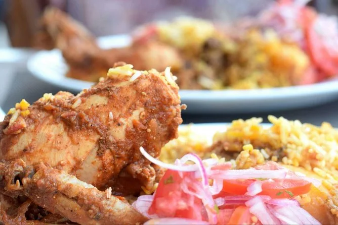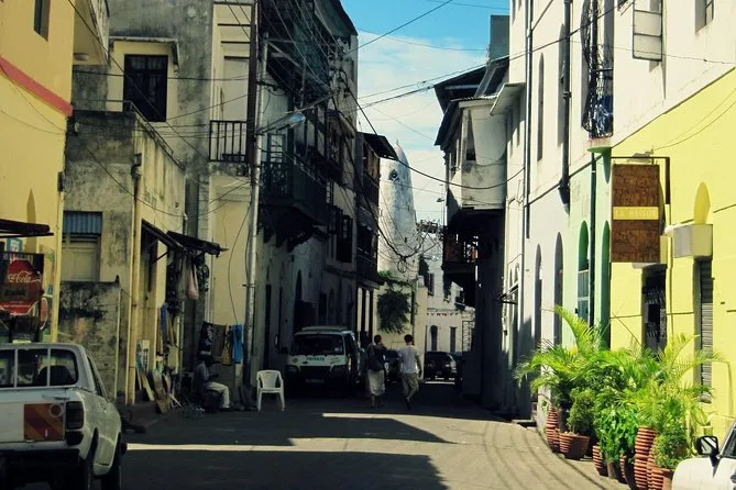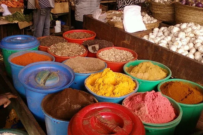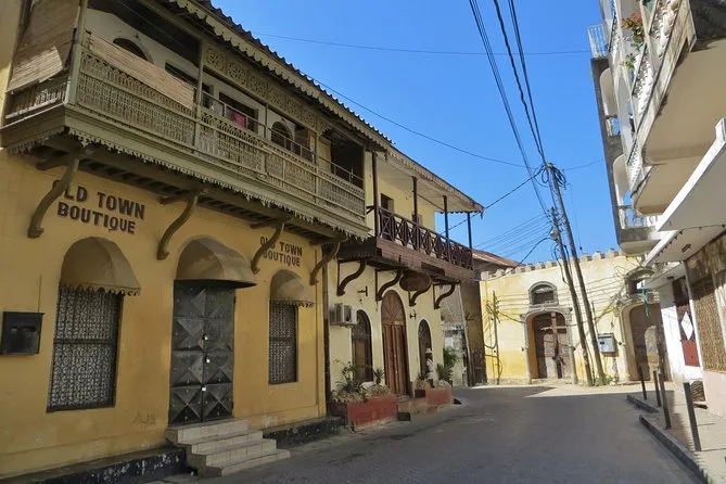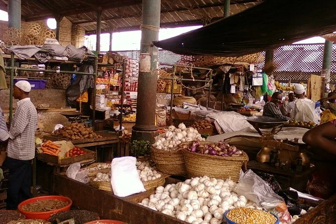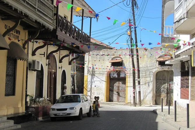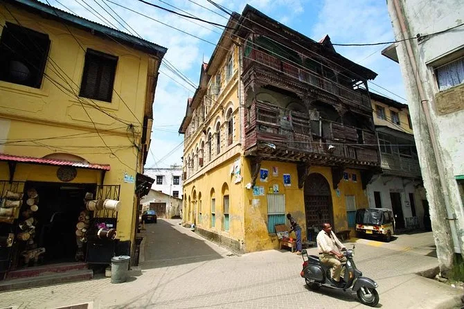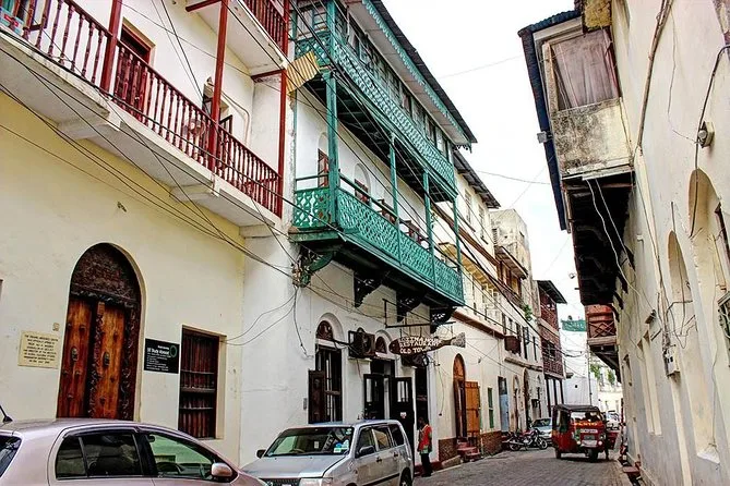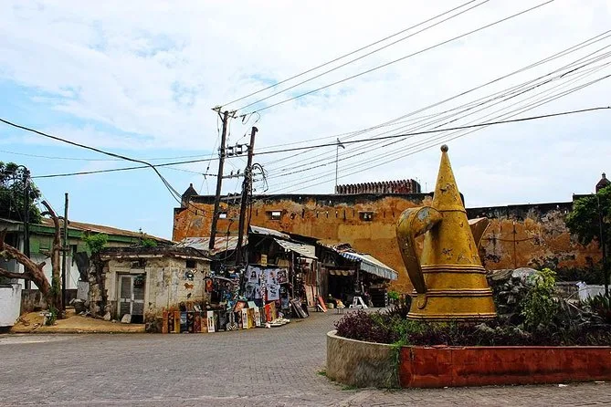 On s’aventure dans des ruelles étroites bordées de maisons coloniales fanées — certaines avec des portes bleues écaillées, d’autres aux balcons en bois sculpté qui grincent sous nos pas. Petite pause à la mosquée Mandhry ; j’entends l’appel à la prière se mêler aux bruits de la rue. Au Old Spice Market, c’est un festival de couleurs : tas de curcuma, citrons séchés et petits piments rouges empilés à perte de vue. Je prends un soda frais dans un petit kiosque avant le déjeuner — bienvenu après toute cette marche sous le soleil de midi.