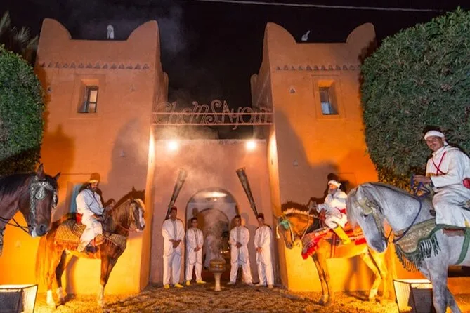 Partagez une soirée de musique berbère live et de saveurs marocaines à Agadir — tapez dans les mains avec les artistes locaux, savourez un tajine mijoté, admirez les cavaliers de la Fantasia passer au galop. Avec le transfert inclus et un guide attentionné, c’est une nuit festive qui reste en mémoire bien après le départ.