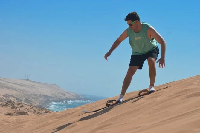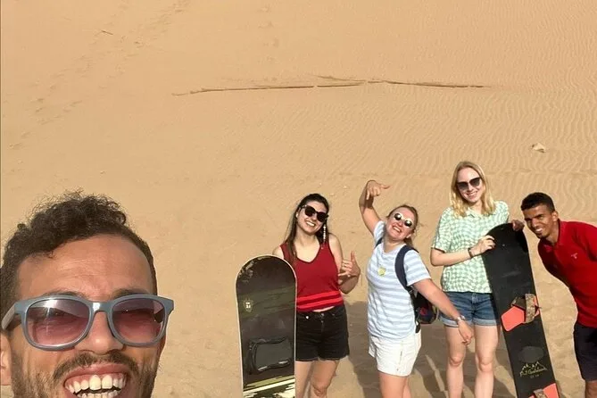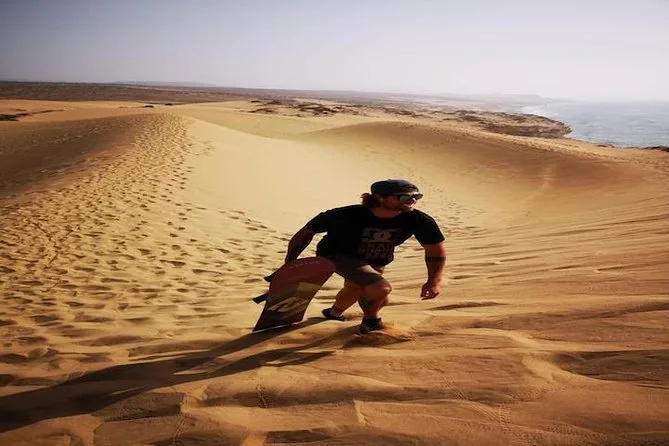 Votre journée comprend la prise en charge à votre pension ou hôtel à Agadir ou Taghazout, un transport climatisé avec WiFi, de l’eau en bouteille tout au long du trajet, tout le matériel pour le sandboard aux dunes de Timlaline avec les conseils de votre guide local Fatima ou Youssef, une halte dans un canyon tranquille pour photos et balade (attention aux chèvres), et des bananes locales sucrées pour reprendre des forces avant de rentrer, couverts de ce sable fin du désert.