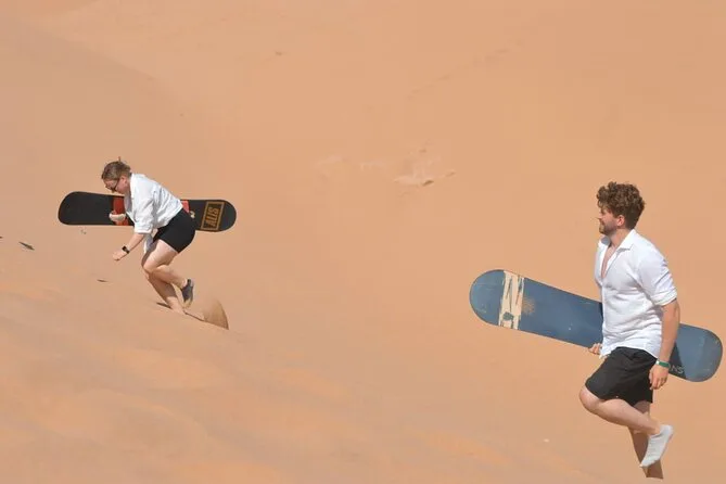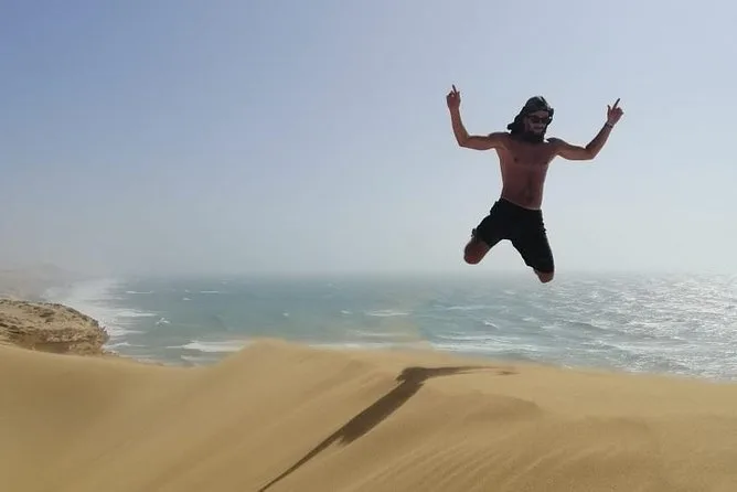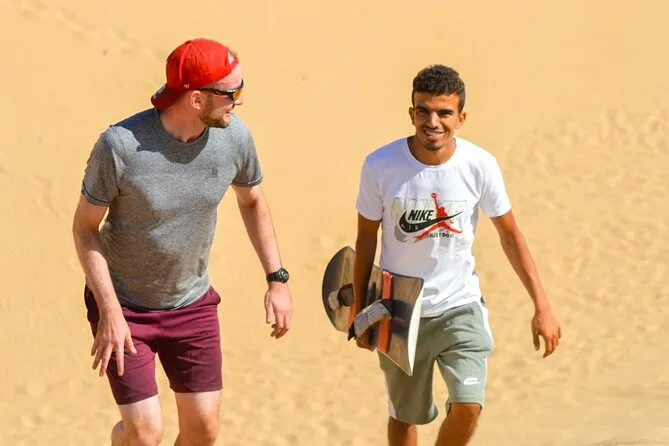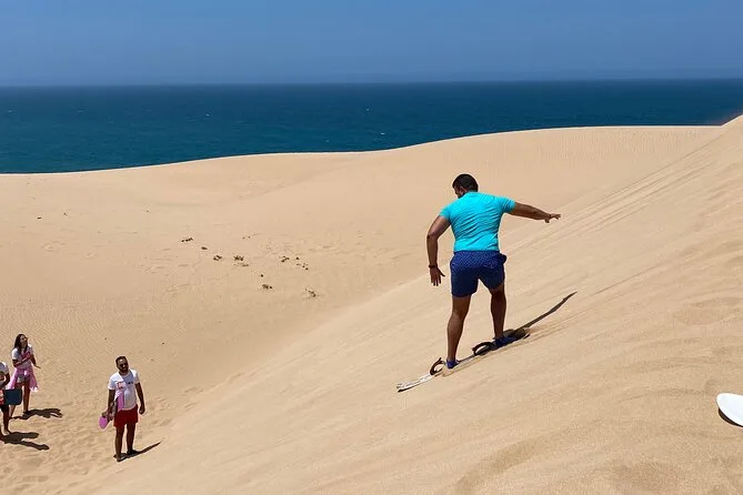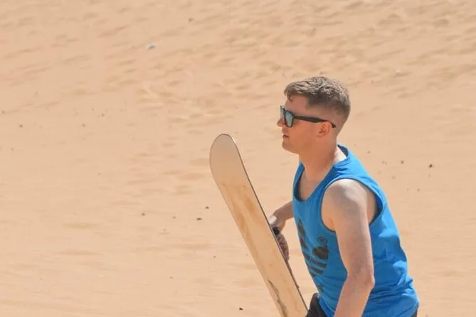 Transport avec prise en charge, eau en bouteille, WiFi à bord, matériel de sandboard, visite d’un canyon secret et bananes locales en collation.