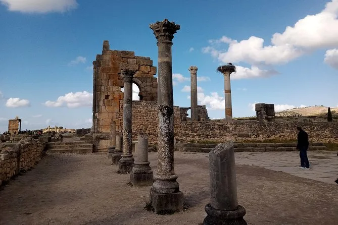 Le lendemain matin, nous sommes partis pour Rabat. La ville offre de larges boulevards bordés de palmiers, mais ce sont les anciennes murailles qui marquent le plus. Notre guide nous a fait traverser les remparts almohades et andalous, en racontant des anecdotes sur l’histoire de la ville. La Tour Hassan, inachevée mais impressionnante, et le Mausolée Mohammed V, tout en marbre blanc et respect silencieux, nous ont fascinés. Sur la route vers Fès, nous avons fait halte à Volubilis. Je ne pensais pas que des ruines romaines pouvaient être aussi bien conservées au Maroc — les mosaïques brillent encore sous le soleil, et les cigognes nichent sur les colonnes. Au coucher du soleil, Fès s’est dévoilée sous nous, ses toits baignés d’une lumière orangée. Après le dîner, un conteur ancien tissait des histoires dans la cour d’un riad caché ; sa voix portait dans la douce nuit.