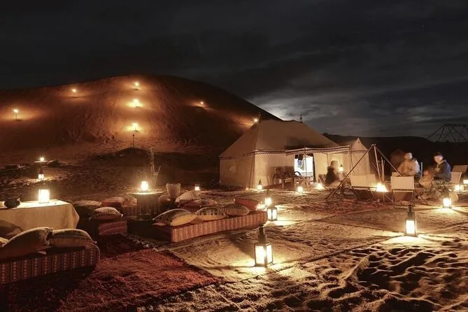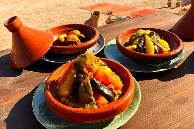 Un dîner marocain gourmet en 3 plats est servi au camp, sous les étoiles.