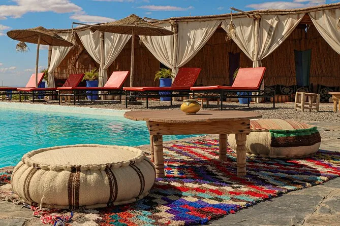 Échangez le tumulte de Marrakech contre les sentiers rocailleux d’Agafay en quad, puis ralentissez le rythme avec une balade à dos de chameau au coucher du soleil sur des collines dorées — avec pauses photos et instants de calme. De retour au camp, rafraîchissez-vous dans la piscine avant un dîner marocain traditionnel en trois plats sous les lanternes, accompagné de musique berbère live au coin du feu. Une soirée où l’on se sent à la fois loin de tout et bien chez soi.