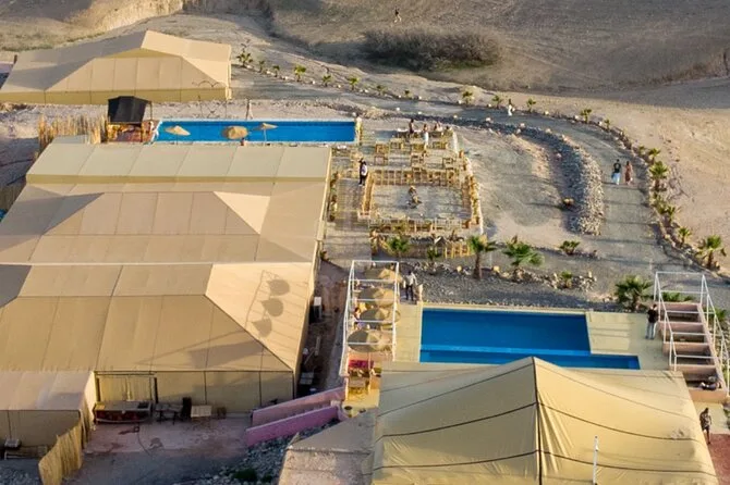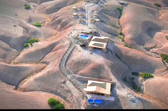 Votre journée comprend la prise en charge à Marrakech (hôtel ou point proche), le transfert vers le désert d’Agafay, l’accès à une piscine scintillante entourée de collines rocheuses, un déjeuner ou dîner marocain traditionnel sous tente berbère (selon votre option), ainsi qu’une heure de quad et une heure de balade à dos de chameau si sélectionné — et pour finir, un spectacle de musique et danse locale en soirée si vous restez tard.