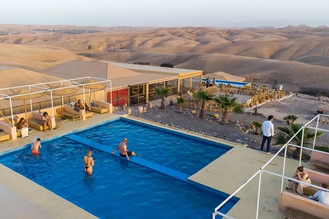 On riait déjà dans le van avant même de quitter Marrakech — notre guide Youssef lançait des blagues sur les conducteurs de la ville et montrait comment la lumière caressait les montagnes de l’Atlas. La route vers le désert d’Agafay est un peu cahoteuse mais pas trop longue (environ 45 minutes, je crois ? J’ai perdu la notion du temps en regardant défiler les oliveraies). Quand on est enfin arrivés, c’était plus calme que ce à quoi je m’attendais — juste le vent et cette odeur sèche et douce qu’on sent au Maroc après la pluie. La piscine brillait comme un mirage. On a posé nos sacs et je vous jure, je n’ai même pas attendu cinq minutes avant de plonger. Il y a quelque chose de magique à nager entouré de collines rocailleuses, ça fait oublier le téléphone.