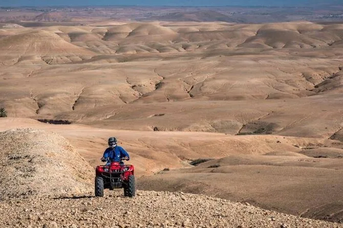 Le déjeuner est servi sous une grande tente berbère — tagine, pain plat encore chaud, thé à la menthe si sucré qu’il m’a fait plisser les yeux. Youssef nous a raconté comment sa grand-mère prépare encore le couscous tous les vendredis (« ça lui prend toute la matinée ! ») et nous a montré comment manger avec seulement trois doigts. J’ai essayé et j’ai fait tomber la moitié de ma carotte sur mes genoux — il a ri et m’a dit que j’avais besoin de m’entraîner. Si vous choisissez l’option activités pour cette journée dans le désert d’Agafay, vous passerez un bon moment à troquer votre serviette contre un casque ou une selle de chameau. Les quads soulèvent une poussière qui se glisse partout (vraiment partout), mais c’est étonnamment fun — on se sent redevenir un enfant.
