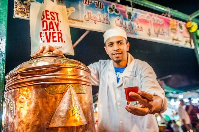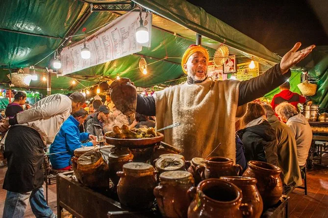 Votre soirée comprend des dégustations de spécialités de rue comme la soupe d’escargots ghoulal et des viandes séchées, une balade dans les souks avec votre guide local ; vous visiterez des marchés d’épices colorés, goûterez olives et pâtisseries en chemin, puis terminerez par un dîner marocain traditionnel au cœur de la vibrante place Djemaa El-Fna avant de poursuivre la nuit à votre rythme.