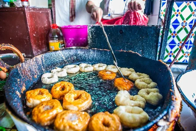 Vous dégusterez des spécialités de rue comme le ghoulal (soupe d’escargots), des viandes séchées dont la patte de bœuf et la tête de mouton, des olives, des fruits secs, des pâtisseries marocaines, et un dîner traditionnel sur la place Djemaa El-Fna.