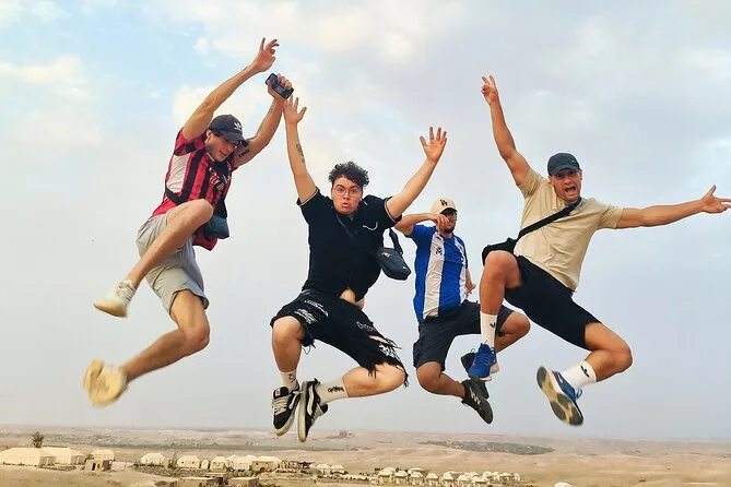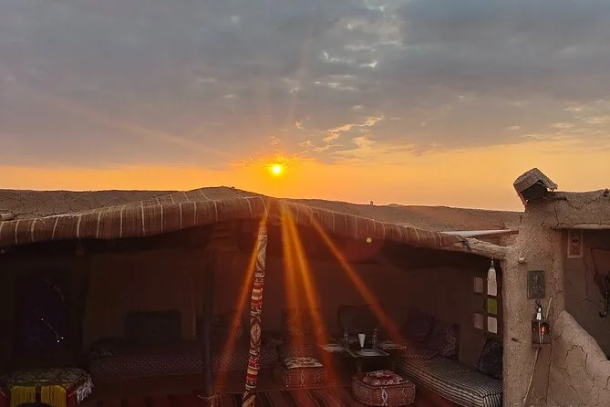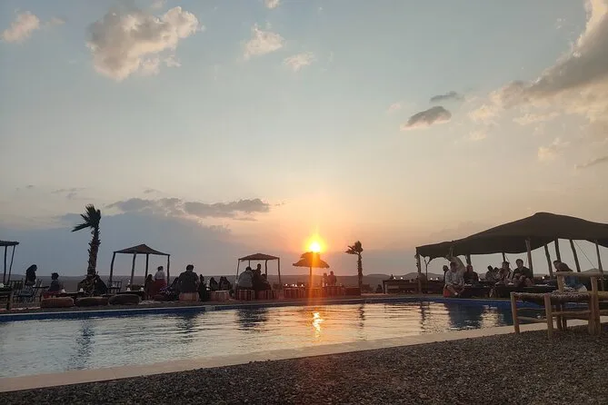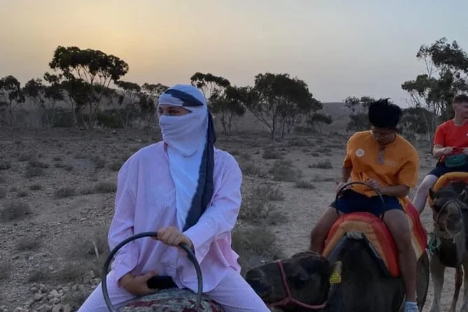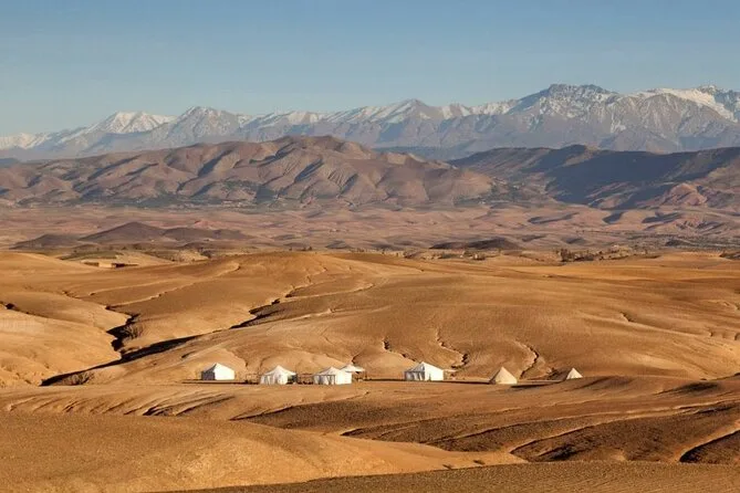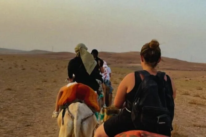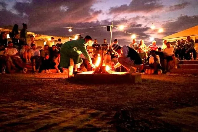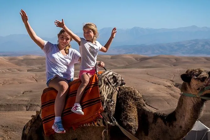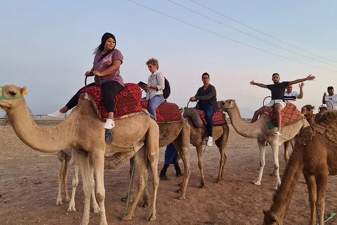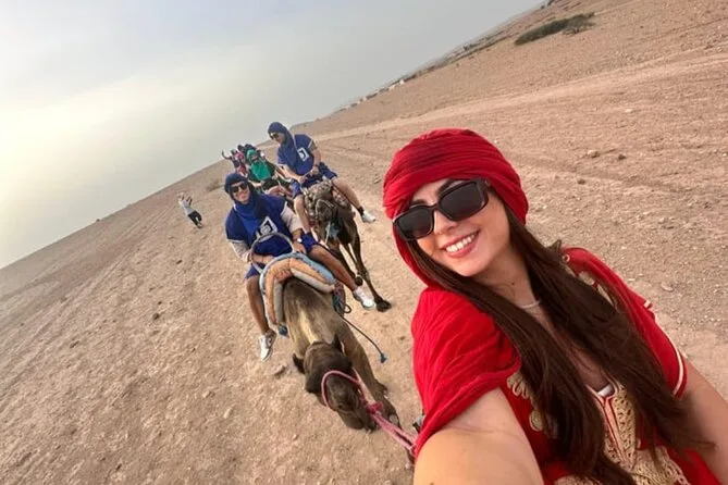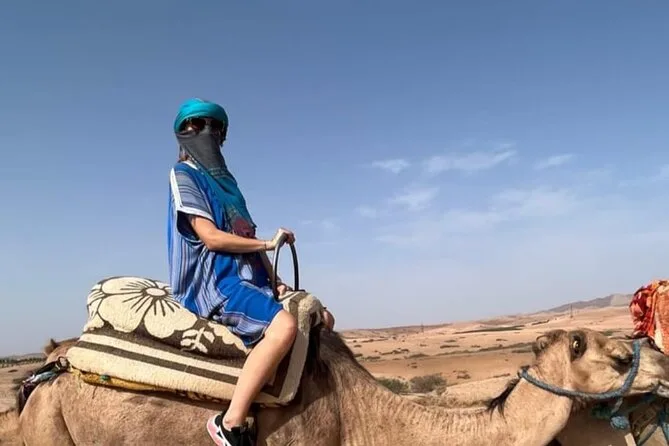 L’expérience inclut le transport depuis Marrakech, la visite d’une coopérative d’huile d’argan, un thé à la menthe au camp, une balade de 20 minutes à dos de chameau, un dîner marocain et un spectacle traditionnel avec musique berbère autour du feu.