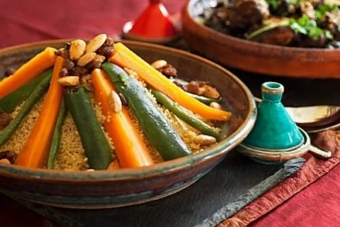 Le dîner comprend des salades locales, un tajine en plat principal, un dessert, ainsi que du thé à la menthe marocain.