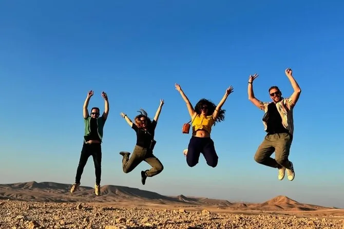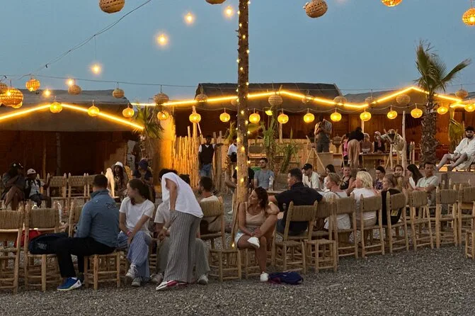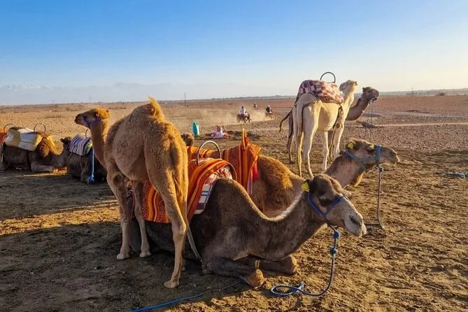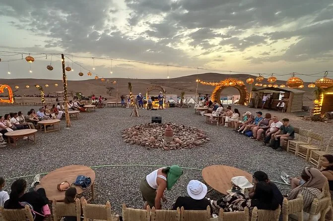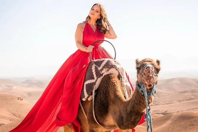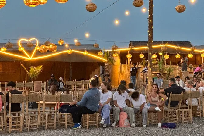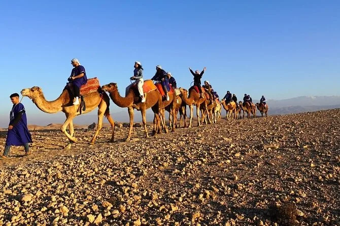 Votre soirée comprend la prise en charge et le retour à votre hôtel à Marrakech en véhicule climatisé, une pause gourmande dans une coopérative d’huile d’argan tenue par des femmes berbères (avec pain maison et thé à la menthe), une balade guidée à dos de chameau sur les dunes rocheuses d’Agafay au coucher du soleil, un dîner traditionnel marocain sous les étoiles avec salades, tajines et dessert, de la musique berbère live autour d’un feu de camp — et un retour confortable en fin de soirée.