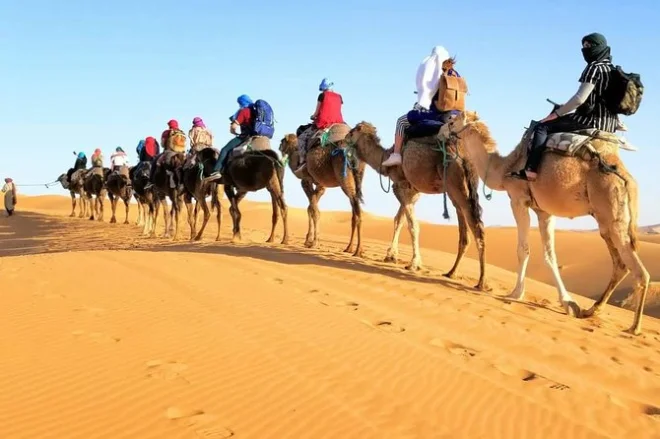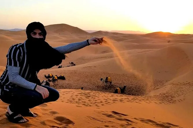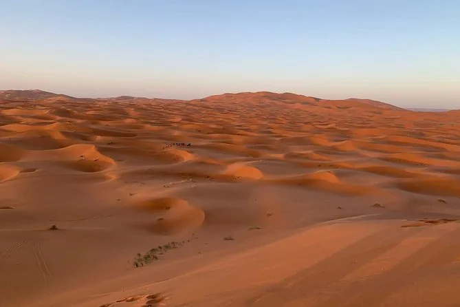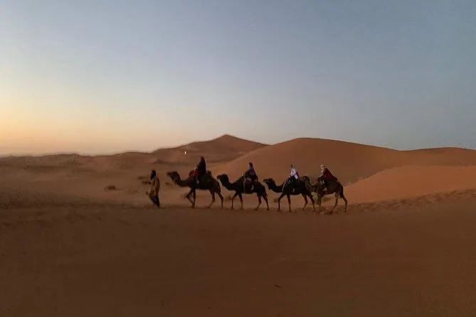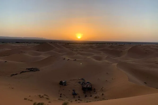 Vos trois jours comprennent la prise en charge à votre hôtel à Marrakech, des visites guidées de la kasbah d’Aït Benhaddou et des villages berbères, une nuit à la Kasbah Dades Amazigh ou équivalent, une nuit en tente privée dans un camp du désert Erg Chebbi (avec linge de lit), deux dîners et deux petits-déjeuners avec des plats marocains locaux, ainsi qu’un trek à dos de chameau dans les dunes — pour finir par un dépôt à votre riad ou hôtel à Fès.