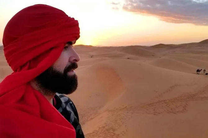 Le lendemain matin, le réveil fut matinal — un café si fort qu’il aurait réveillé les morts — puis nous avons repris la route à travers l’oasis de Tinghir. Nous avons marché le long de la rivière Todgha, sous les oliviers, salués par des enfants aux portes des maisons. Notre guide nous a présenté Ahmed, un agriculteur local qui nous a montré comment il irrigue ses terres avec des canaux ancestraux. Il y a eu un moment dans les gorges du Todra où tout s’est tu, seuls les oiseaux et nos pas résonnaient contre les falaises. Puis est venue Merzouga : les chameaux attendaient au coucher du soleil, leurs ombres s’allongeant sur les dunes orangées. Monter dans l’Erg Chebbi était presque irréel — un peu maladroit au début (mes jambes s’en souviennent encore), puis on se laisse bercer par le rythme.