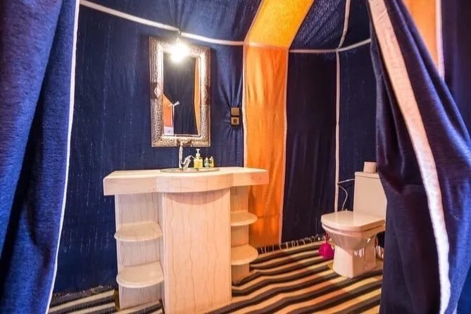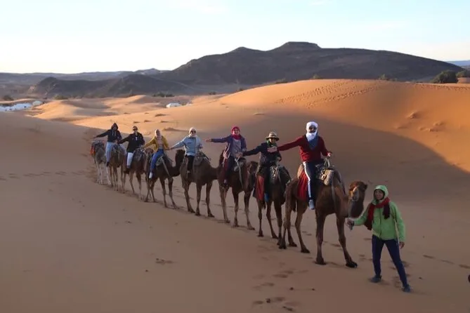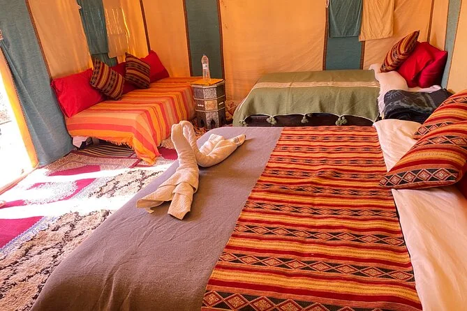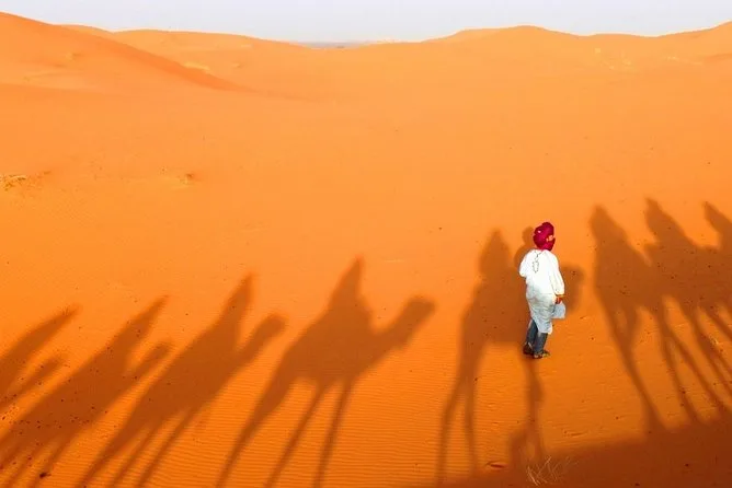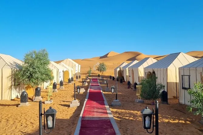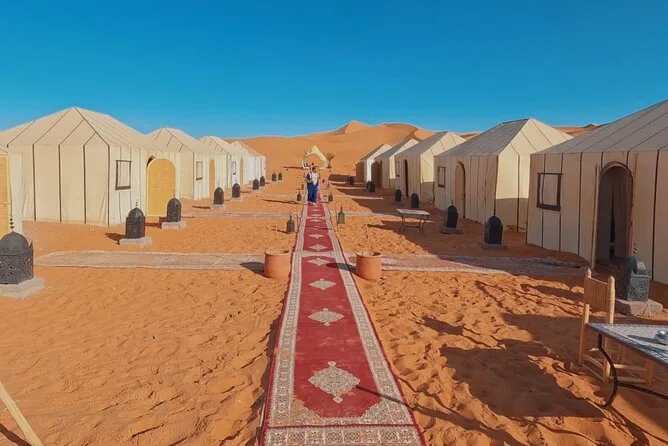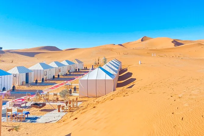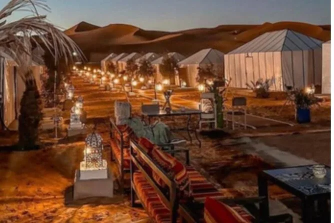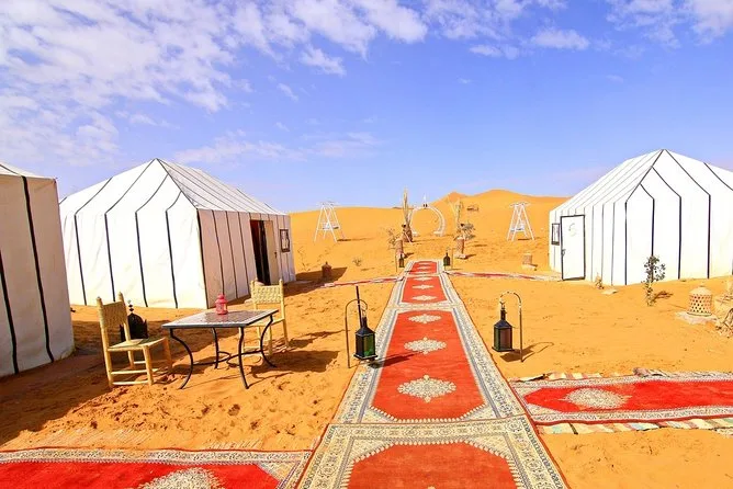 Votre voyage comprend le transfert depuis votre hôtel à Marrakech tôt le matin, une nuit avec dîner et petit-déjeuner à l’hôtel des gorges du Dadès (avec piscine), tous les transferts entre les sites, notamment à travers l’Atlas et les kasbahs célèbres comme Ait Ben Haddou, une balade à dos de chameau ou en 4x4 jusqu’au désert de Merzouga où vos bagages vous attendent dans un camp de luxe avec toilettes et douche privées dans chaque tente ; ainsi que des dîners traditionnels avec musique berbère live autour du feu et du sandboard avant de revenir à Marrakech en soirée le troisième jour.