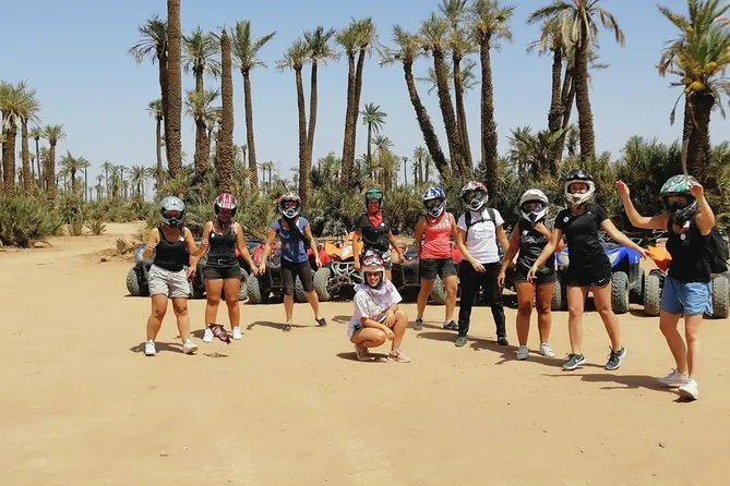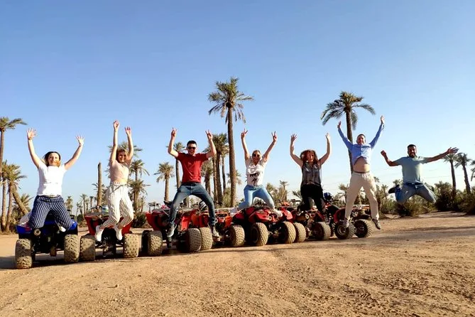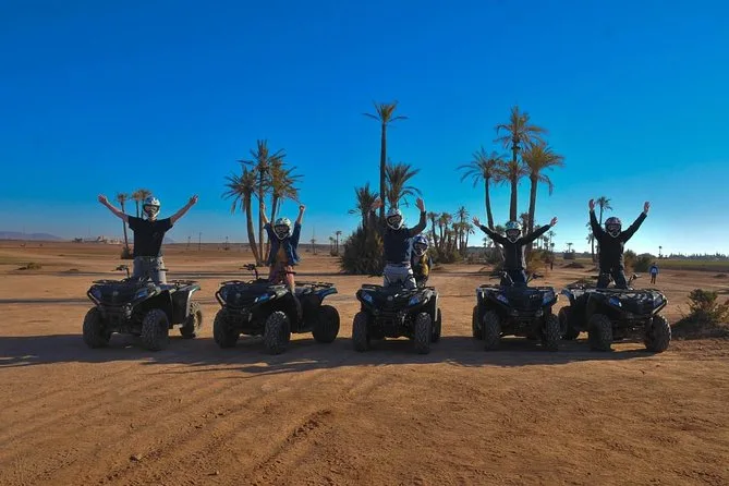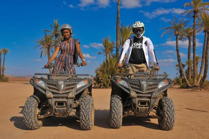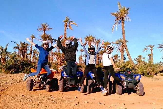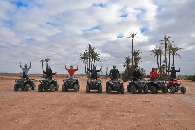 Votre journée comprend la prise en charge à votre hôtel de Marrakech en véhicule climatisé, près de deux heures de conduite libre en quad dans la Palmeraie avec tout le matériel fourni, un guide local professionnel tout au long, ainsi qu’une pause rafraîchissante pour un thé à la menthe avant le retour en ville.