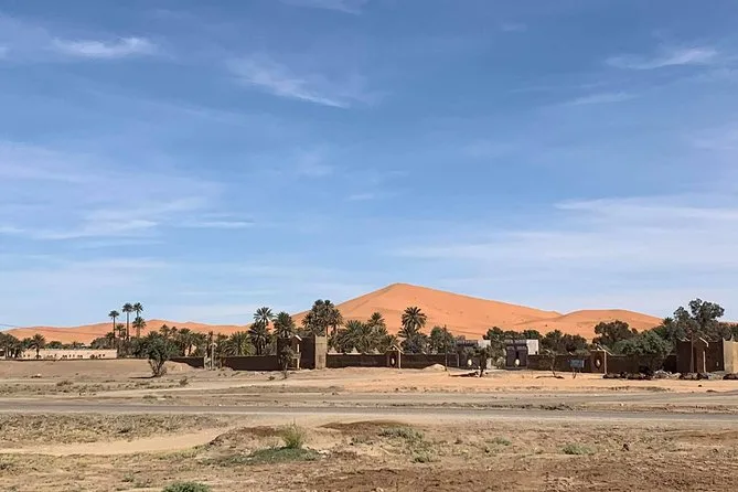Le trajet se fait en deux étapes : d’abord jusqu’à la vallée du Dadès (environ 6-7 heures), puis jusqu’aux dunes d’Erg Chebbi via les gorges du Todra le deuxième jour.