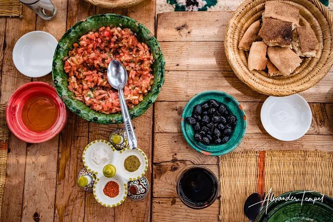 Vous dégusterez une salade de tomates ou une soupe maison, un tagine de poulet, du couscous, un dessert aux fruits, ainsi que du thé à la menthe et de l’eau.