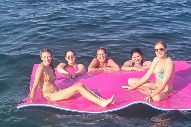 On a ralenti près des formations rocheuses — El Arco semblait encore plus étrange de près, comme une œuvre inachevée de la nature. Les pélicans restaient là, indifférents à notre présence. Après une série de photos (et un selfie raté où on ne voyait que mon front), on a mis le cap sur Chileno Bay. Le trajet n’a pas duré longtemps — environ 30 minutes — mais assez pour grignoter du guacamole avec des chips et éviter de me tâcher de salsa à chaque vague. L’équipage a installé des paddleboards et un énorme tapis flottant qu’ils appelaient nénuphar ; certains ont préféré plonger avec masque et tuba. L’eau était plus fraîche que prévu, mais pleine de poissons colorés qui filaient partout — c’était presque irréel sous la surface.