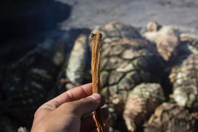La descente dans la vallée fait environ 5 km — pas trop difficile, mais assez poussiéreuse pour que mes chaussures gardent la trace du chemin. On s’est arrêtés sous un arbre où Marisol a montré des herbes sauvages qui poussaient le long du sentier ; elle en a cueilli une en disant que sa grand-mère en fait une infusion. Après ce qui m’a paru une éternité (mais sûrement pas), on est arrivés au palenque de Don Jeronimo. Il nous a montré comment sa famille fabrique le mezcal — une odeur douce et fumée partout — et on a goûté directement dans ces jarres en verre. J’ai essayé de dire « salud » correctement ; Don Jeronimo a juste souri et a versé un autre verre.
