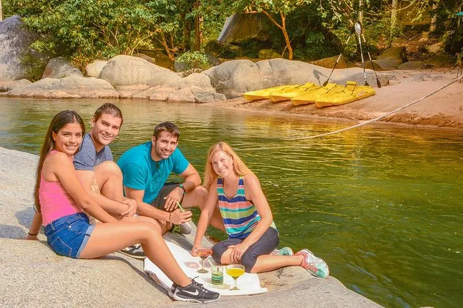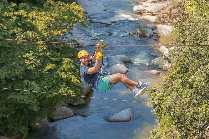 Votre journée comprend le transport aller-retour depuis Puerto Vallarta en bateau rapide ou camion jungle (au choix), les 19 tyroliennes avec tout l’équipement de sécurité et des guides bilingues pour vous accompagner à chaque étape. Ensuite, vous aurez le temps de nager ou faire du kayak dans des piscines naturelles avant de savourer un déjeuner complet au bord de la rivière avec boissons tropicales et dégustation traditionnelle de tequila — le tout avant de retourner en ville.