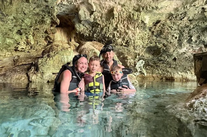 Le trajet jusqu’au cenote Taak Bi Ha a été court mais on avait l’impression d’entrer dans un autre monde—la jungle dense nous encadrait de chaque côté. Une fois arrivés, nous étions seuls avec une autre famille. L’air à l’intérieur était frais, avec une légère odeur minérale, presque douce et terreuse. J’ai hésité au début (l’eau froide me fait toujours un peu peur), mais une fois dedans, on flotte comme dans une grotte secrète—la lumière se reflète sur les formations rocheuses sous l’eau. Mon ami a essayé de prononcer “cenote” correctement ; Luis a ri en disant qu’on s’améliorait à chaque fois.